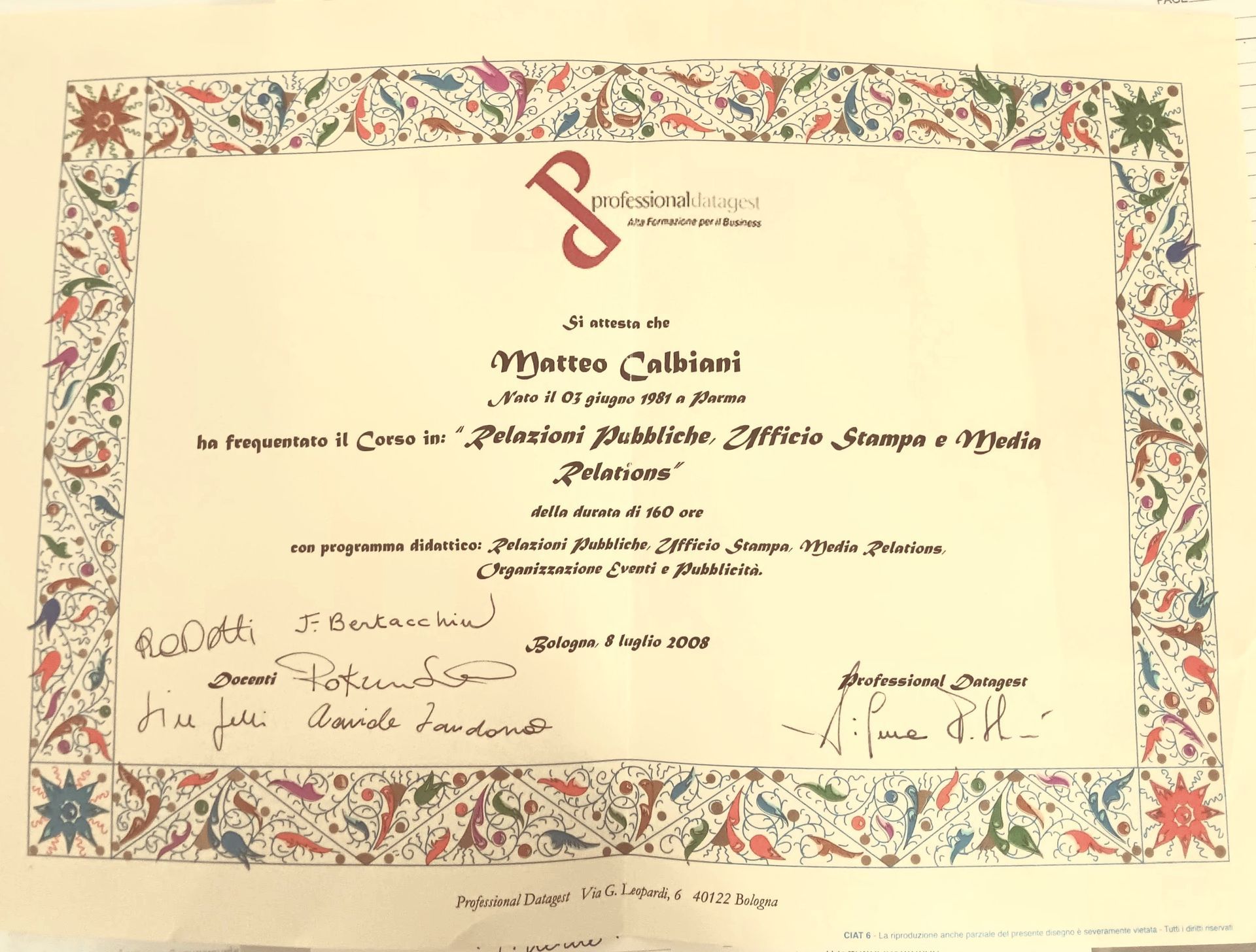 Alla guida di Calbiani Personal Services snc c’è il Sig. Calbiani, laureato all'Università di Parma in laurea in Civiltà Letterarie e Storia delle Civiltà, ha conseguito con successo il Certificato di "Infermieristica di base con il tedesco per l’infermieristica", rilasciato dal centro di formazione BTB Bildungszentrum GmbH di Berlino secondo gli standard AZAV e DIN EN ISO 9001:2008. Il programma, finanziato dal Fondo Sociale Europeo e dal Senato di Berlino, ha incluso: 760 ore totali di formazione professionale teorica e pratica incluso tirocinio professionale, studio del linguaggio tecnico in ambito assistenziale, formazione su assistenza geriatrica, primo soccorso, igiene e alimentazione, ha avuto esperienza presso le case di cura del gruppo Bockelmann Haus, Johanniter ed Hermann Strauss a Berlino in Germania. Il sig. Calbiani ha gestito parallelamente un servizio di impresa di pulizie per privati e attività commerciali, svolgendo il lavoro personalmente e collaborando con aziende di servizi di pulizia domiciliari e alberghiere.